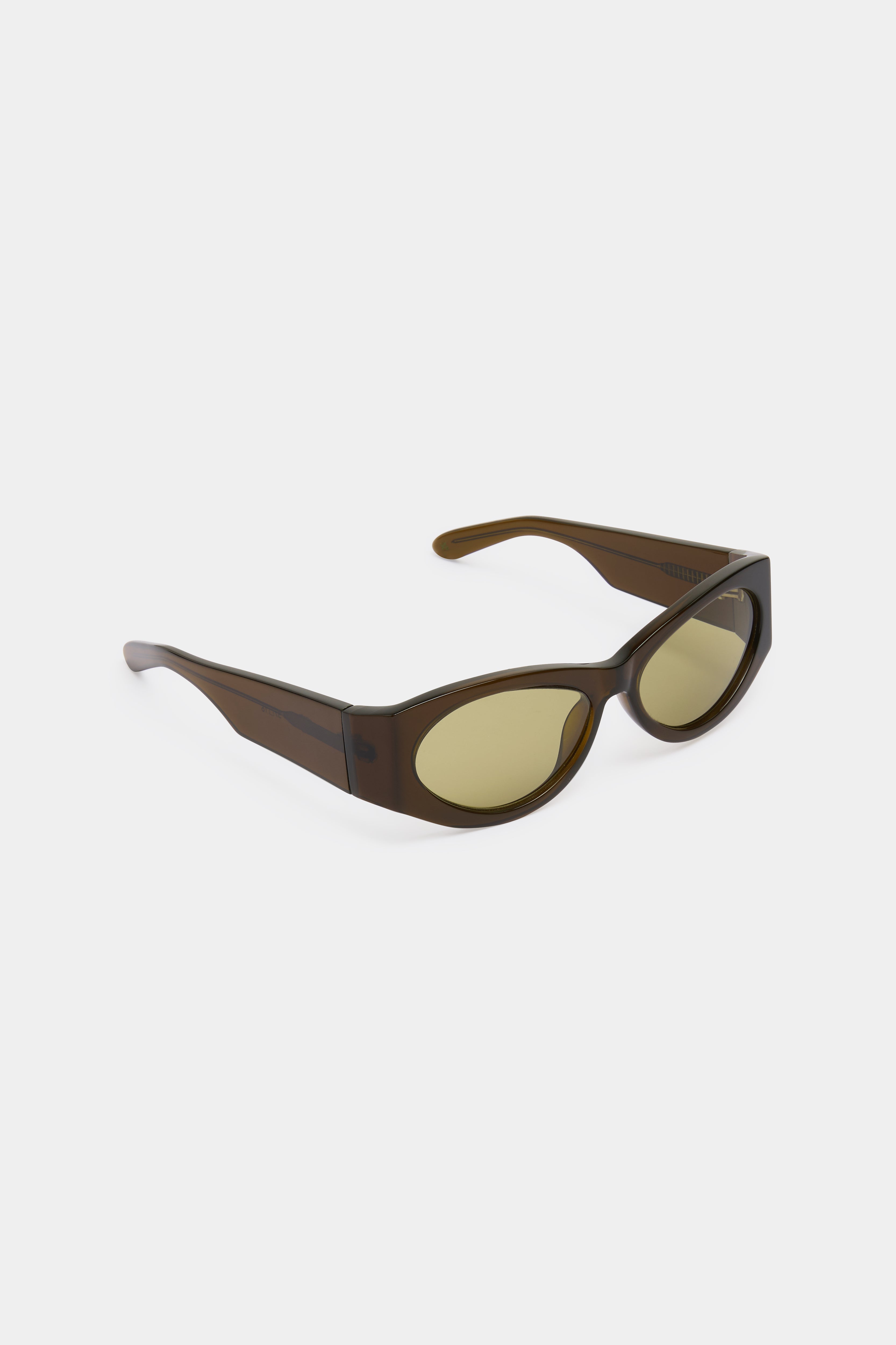 The Classic Sunglasses in Olive. Embracing a modern twist on a vintage cat eye shape. Handcrafted from Italian Mazzuchelli acetate, providing comfort and flair with a bold shape and curving eye.