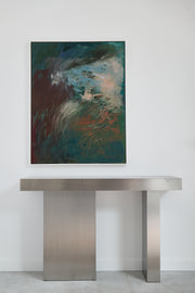 I use oil paint, oil bars, pigments mixed with mediums like wax paste or oleo gel and I paint on canvas. I always paint portrait orientation unless it’s for a custom piece because it’s my preference. Portrait speaks more to the idea of a door, window, mirror or portal. There’s more of an instinctive reading or intention toward the human/self rather than being framed as “I’m looking at a nice landscape”.