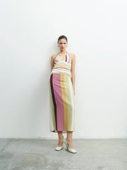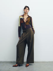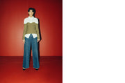 The prints and color palette of the collection are inspired by the works of Afro Basaldella, blending vibrant artistry against architectural sharp lines.