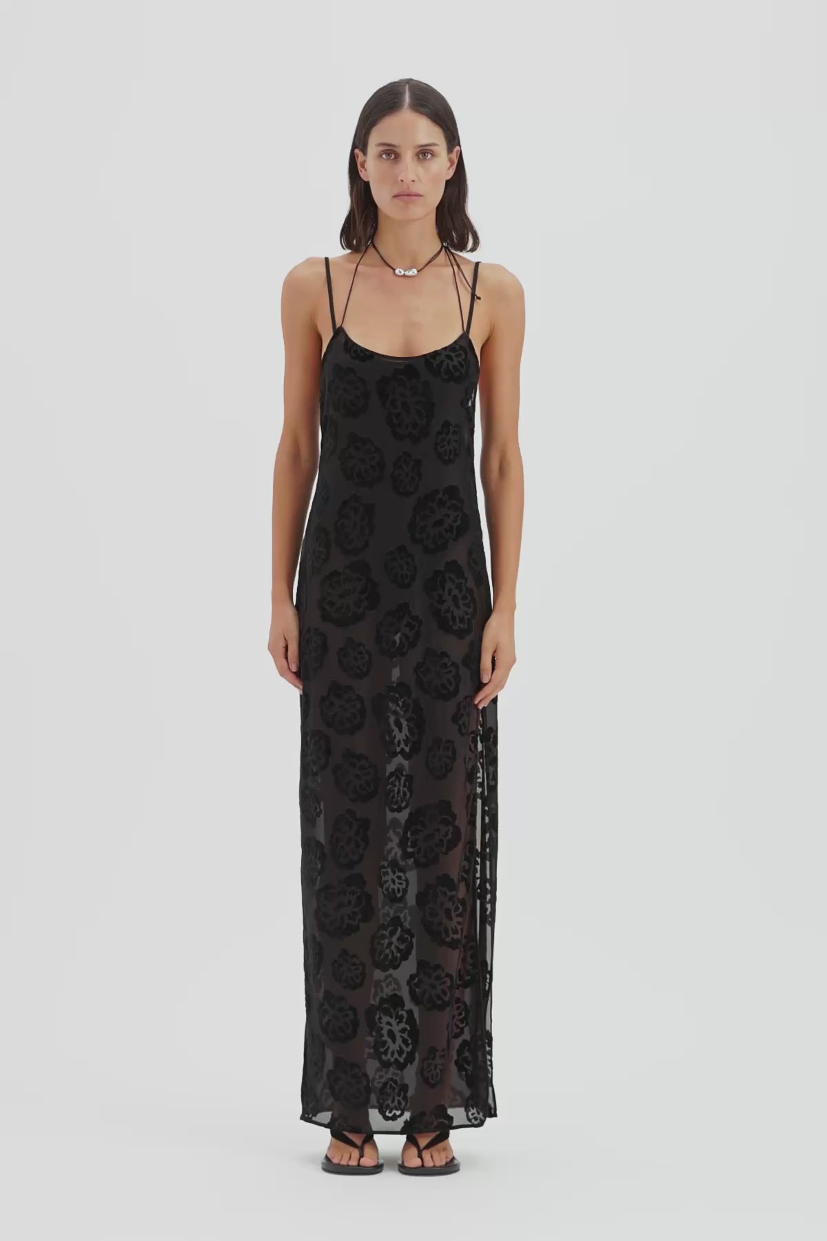 Semi-sheer stretch burnout fabrication in exclusive SIR. floral artwork